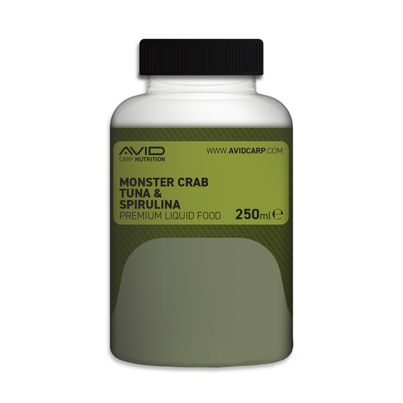 Additivo liquido di marca Avid Carp, gamma Premium, sapore Monster Crab-Tonno e Spirulina, speciale per le vostre esche da carpfishing.