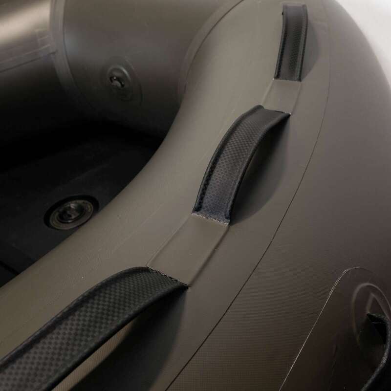Barca compatta del marchio Raptor modello 270 X-Wide con pavimento ad aria a Colore verde, soprattutto per il carpfishing. Design adatto all'uso in acque piccole e a sessioni veloci.