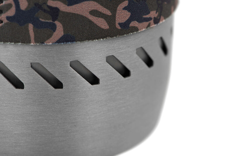 - Include un manicotto in neoprene color camo che può rimanere sulla pentola
