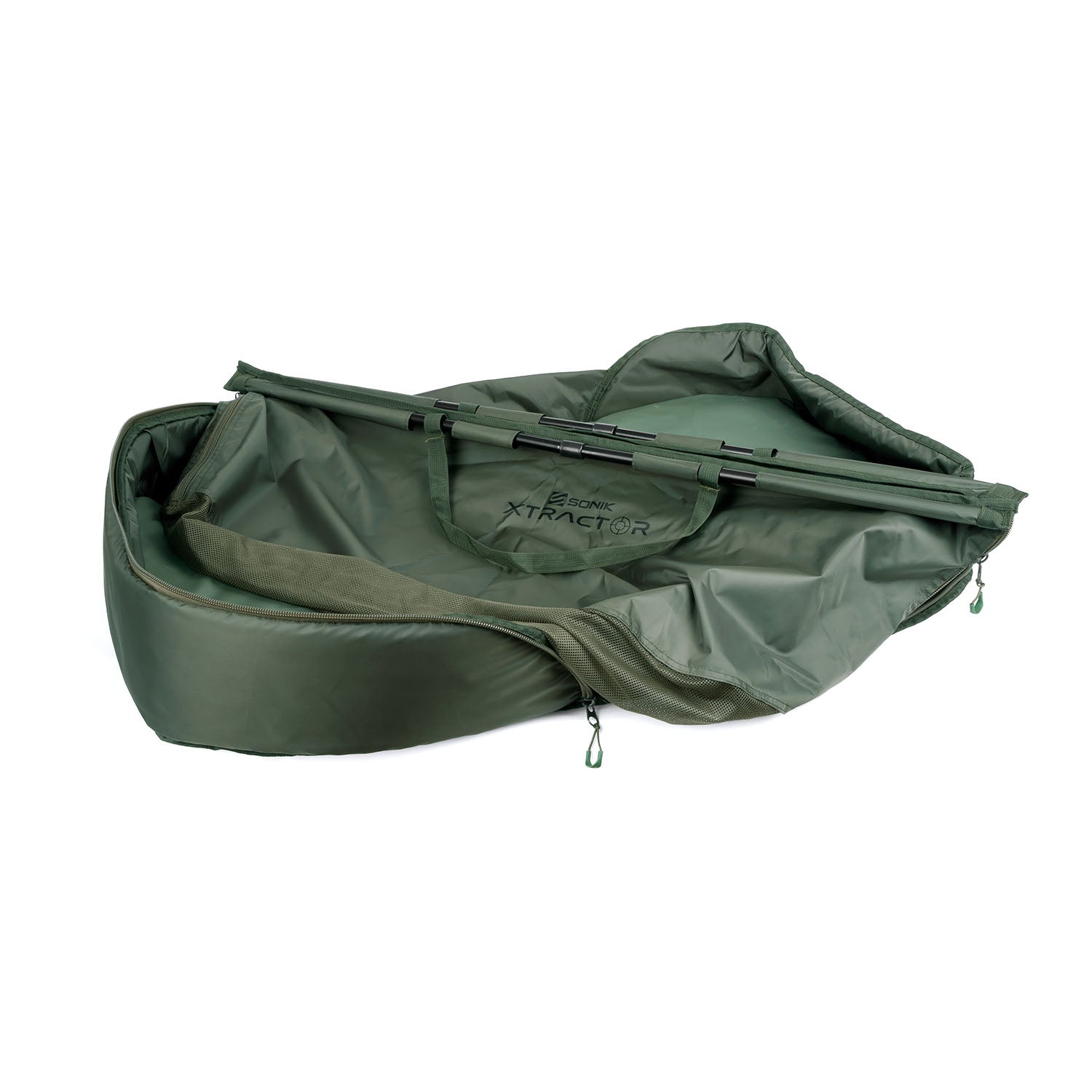 Lettino pieghevole del marchio Sonik modello Xtractor a Colore verde, soprattutto per il carpfishing.