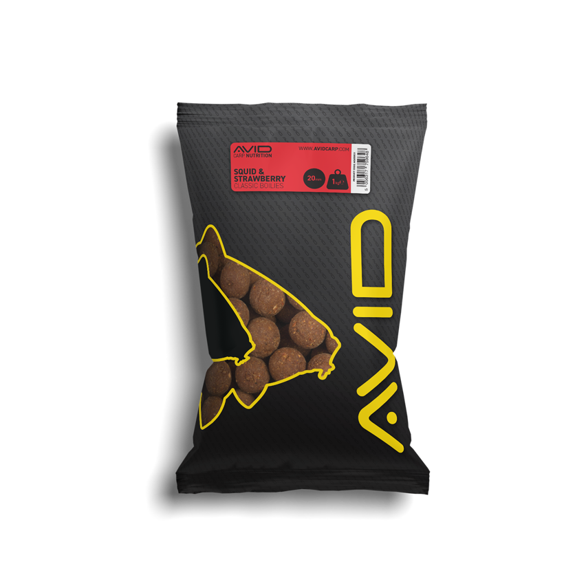 Boilies del marchio Avid Carp, gamma Classic, gusto Squid & Strawberry, speciale per il carpfishing.