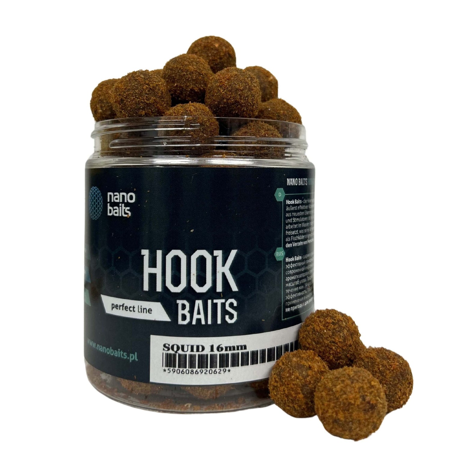 Hook baits marchio temprato Nano Baits, sapore Squid, su Colore marrone, per mantenere più a lungo l'esca all'amo.