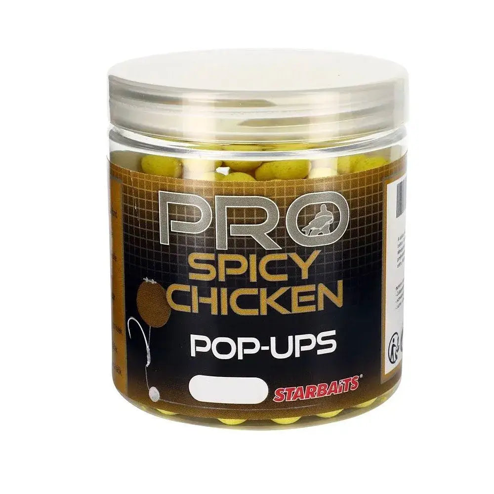 Pop Ups galleggianti di 14 mm del marchio Starbaits gamma Probiotic gusto pollo piccante a colori giallospeciale per il carpfishing.