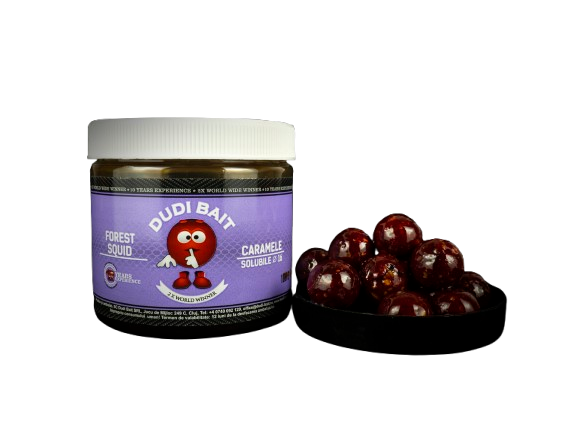 Boilies solubile selezionato per il posizionamento del marchio Dudi Bait da 20 millimetri gamma Glugged sapore foresta di calamarispeciale per il carpfishing.
