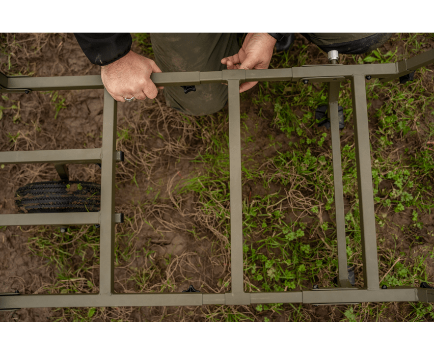 - Dotato di pneumatici robusti e di grandi piedini per il fango Korum per garantire la stabilità su terreni irregolari