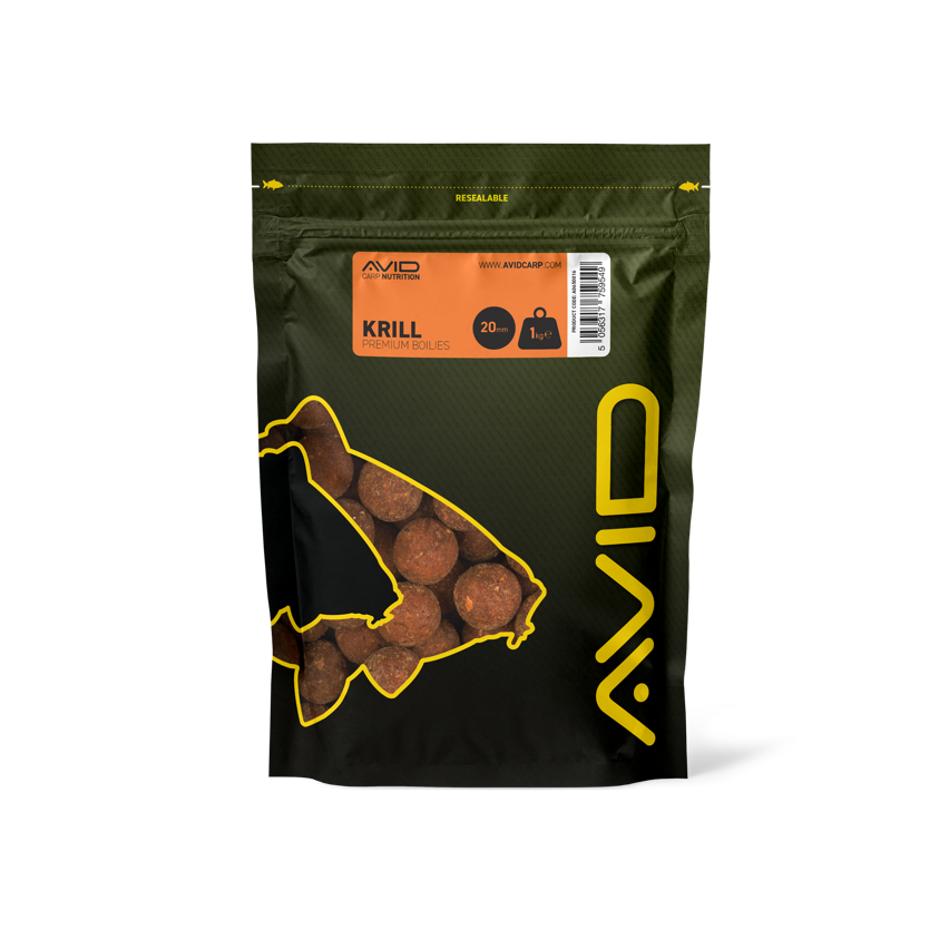 Boilies del marchio Avid Carp, gamma Premium, gusto Krill, specialmente per il carpfishing.