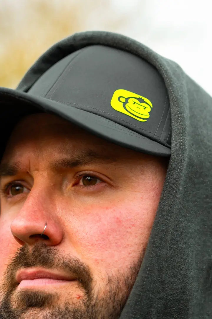 Classico cappellino da baseball del marchio Ridge Monkey modello Apearel SportFlex in grigio scuro Colore con logo giallo sul davanti.