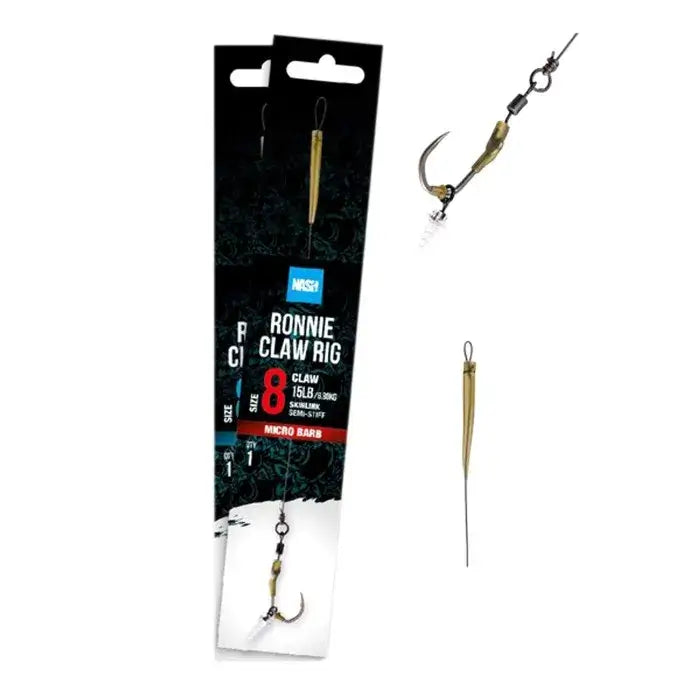 Ganci montati del marchio Nash modello Ronnie Claw Rigspeciale per il carpfishing. Disponibile nella misura 6.