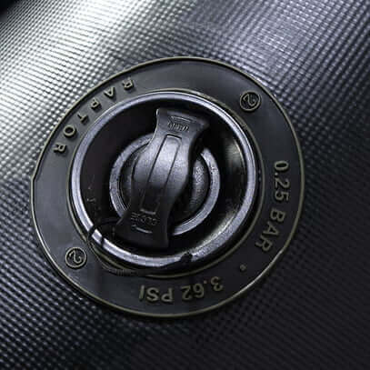 Barca compatta del marchio Raptor modello 180 Belly Wide con pavimento ad aria a nero carbone, speciale per il carpfishing.