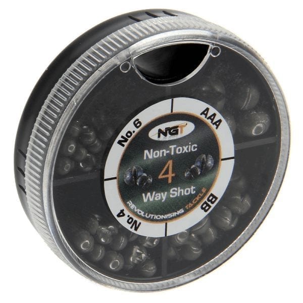 Scatola per piombi con 4 scomparti con piombi di dimensioni diverse per bilanciare le posizioni di galleggiamento.