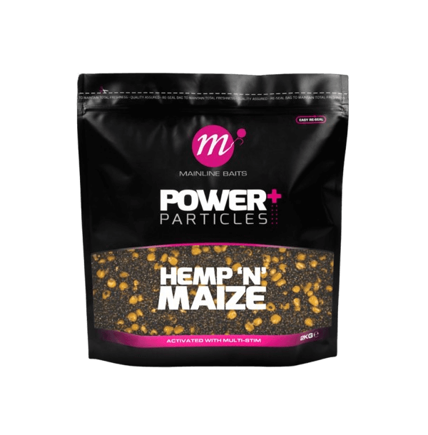 Miscela di semi del marchio Mainline gamma Power+ con un assaggio di Hemp 'N' Maizespeciale per il carpfishing.
