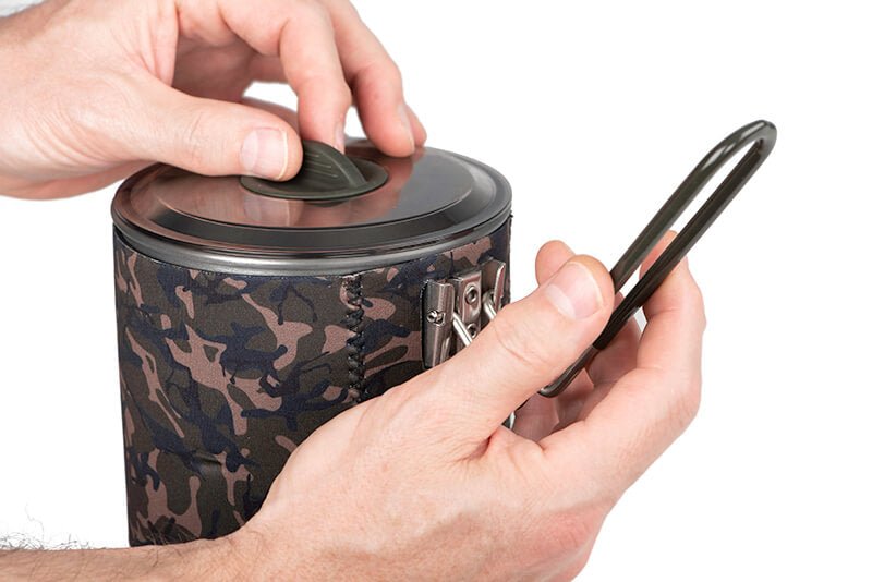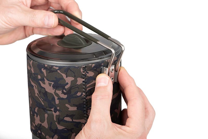 - Include un manicotto in neoprene color camo che può rimanere sulla pentola