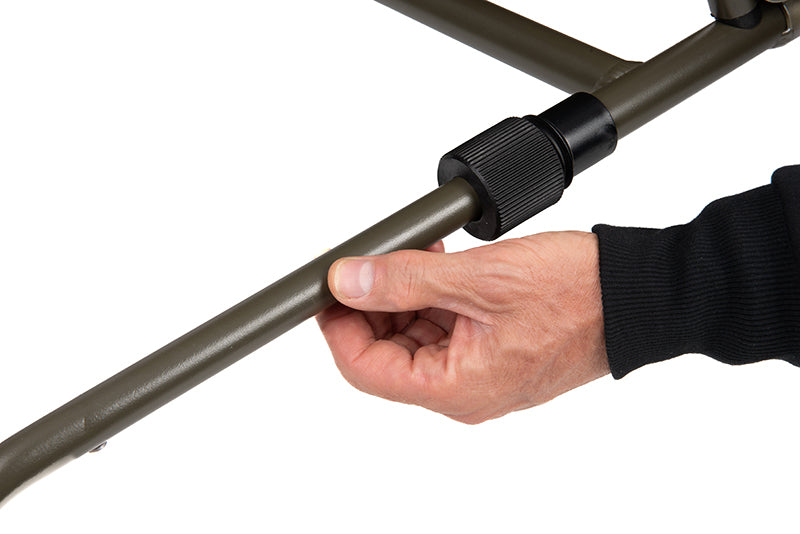 - Armazón regulable con tres modos de uso: acoplado a la cama como compañero clásico, fijado al lateral del chasis de la bedchair o colocado en la parte frontal del vivac como silla baja independiente