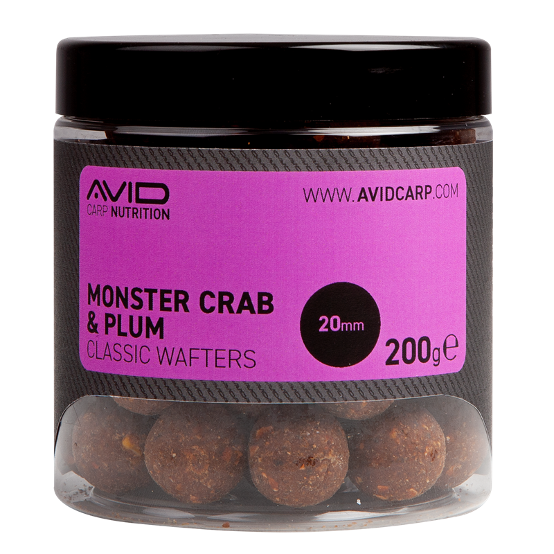 Wafters del marchio Avid Carp, gamma Classic, gusto Monster Crab & Prugna, specialmente per il carpfishing.